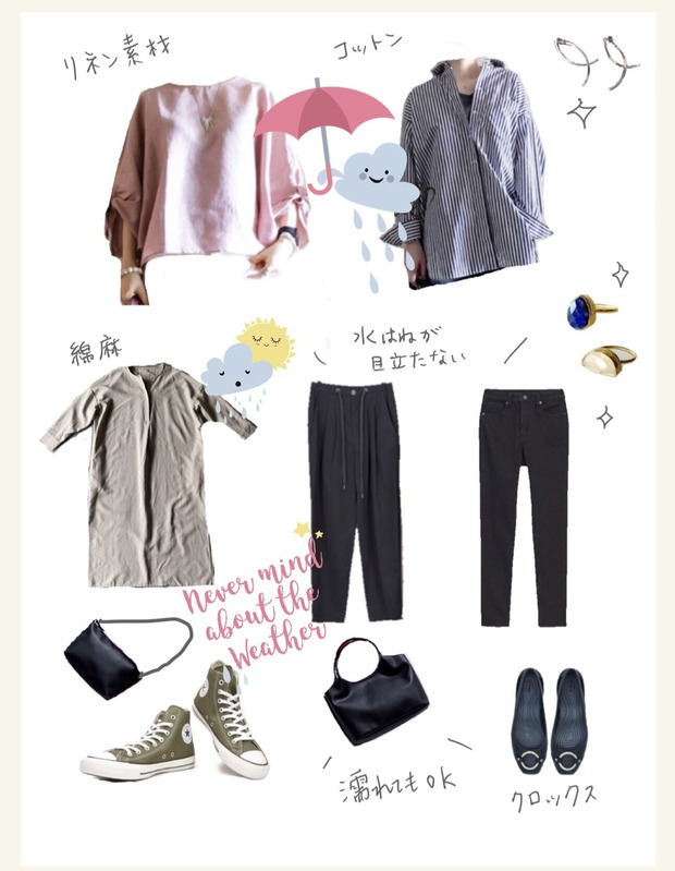 梅雨のファッション、過ごしやすい生地やテンションの上がる小物 2021/05/25 こんにちは!今朝は晴れて清々しい天気のこちら地方です。昨日は一日雨でした今年はまだ5月だというのに梅雨入りして、傘が手放せない日が多いのですが雨の日を快適に過ごせる服があると気分も違ってきます。私のワードローブから雨の日に着る服をピックアップしてみました ... READ MORE